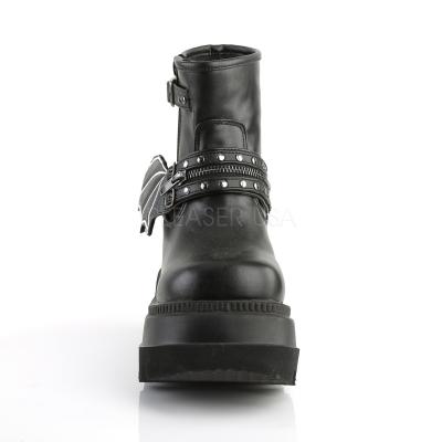 4 1/2 インチ (11.4 cm) バットウィング ジッパー式ストラップ付きウェッジ プラットフォーム アンクル ブーツを積み上げ、外側の Zip を公開(Wedge PF Ankle Boot W/Batwing Strap, Outer Side Zip)