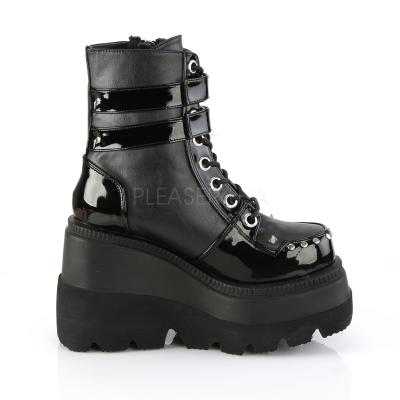 4 1/2 インチ (114 mm) ウェッジ プラットフォーム編み上げ足首ブート搭載ダブル フック N' ループのストラップ、金属ファスナー外のヴァンプのグロメットとスタッド ・ スパイク外特大 w/PVC パネルをクリア(Wedge PF Lace-Up Ankle Boot, Outside Zip)