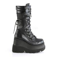 4 1/2"くさびプラットフォーム レースアップ曲線のコントラスト パネル デザイン、ヴァンプ、全室のホースシュー リング飾りバックル ストラップ w/スタッズ スパイク金属板と大型の o リング w/ブーツふくらはぎ、金属バック Zip 閉鎖