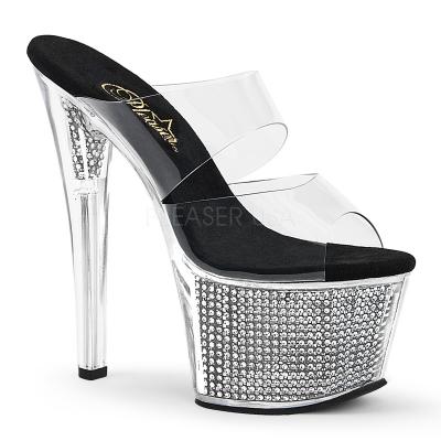 7 インチ (17.8 cm) ヒール、クローム メッキ、特色 2 3/4 インチ (7 cm) のプラットフォーム 2 つバンド スライド シミュレート ラインス トーンいっぱいプラットフォーム(PF Two Band Slide W/Simulated RS Filled BTM)
