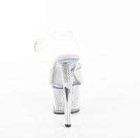 7インチ(178mm)ヒール、2 3/4インチ(70mm)プラットフォームアンクルストラップサンダル(丸みを帯びて滑らかなエッジ、透明で柔らかいTPUアッパー、シルバーラインストーンフィッシュネット生地オーバーレイ、シミュレートラインストーン充填プラットフォーム)。この「TPUプレミアム」スタイルには、交換可能な同色インソールとクリアなプラットフォームプロテクターが付属しています。(PF Rhinestone Net Ankle Strap Sandal)