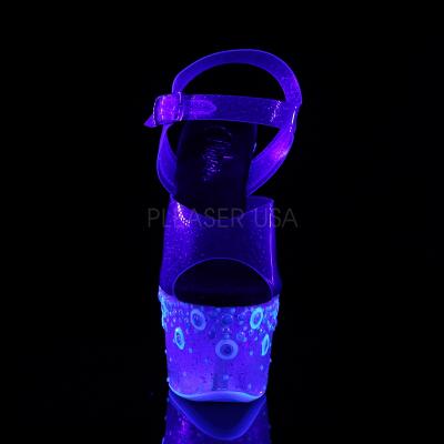 UV ブラック ライト反応性アウトソール/Toplift、軌道舗装ホロ真珠ミニ キラキラ UV ブラック ライト反応で装飾された 7 インチ (17.8 cm) ヒール、2 3/4 インチ (7 cm) プラットフォーム アンクルス トラップ サンダル プラットフォーム全体の特徴(PF Ankle Strap Sandal)