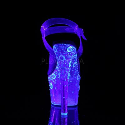 UV ブラック ライト反応性アウトソール/Toplift、軌道舗装ホロ真珠ミニ キラキラ UV ブラック ライト反応で装飾された 7 インチ (17.8 cm) ヒール、2 3/4 インチ (7 cm) プラットフォーム アンクルス トラップ サンダル プラットフォーム全体の特徴