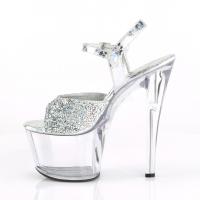 7 インチ (178 mm) かかと、Slv マルチ ラインス トーン、フロント ヴァンプ w/2 3/4 インチ (70 mm) プラットフォーム アンクルス トラップ サンダル