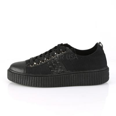 1 1/2 インチ (38 mm) プラットフォーム ゴム唯一低上部ラウンドつま先観賞用ジッパー アイレット近くフラット スタッド詳細ワット/レースアップ フロント クリーパー スニーカーをトリミングし、スタッド ラウンド側面をパネルをエンボス加工(PF Round Toe Lace-Up Front Low Top Creeper Sneaker)