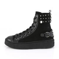 1 1/2 インチ (38 mm) プラットフォーム ゴム唯一の高い一番上の丸いつま先レースアップ フロント クリーパー スニーカーかふ付けスナップ襟と w/スタッド装飾バックルかかとのストラップの特徴