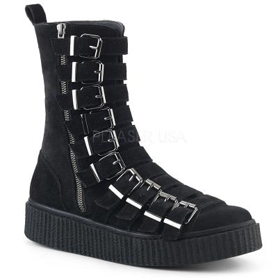 1 1/2 インチ (38 mm) プラットフォーム ゴム唯一丸いつま先クリーパー スニーカー起動背面とストラップ付きフロント バックル アップ、金属ファスナー外完全全室 Pyrmid 鋲(PF Round Toe 10 Buckle Calf High Creeper Sneaker Boo)