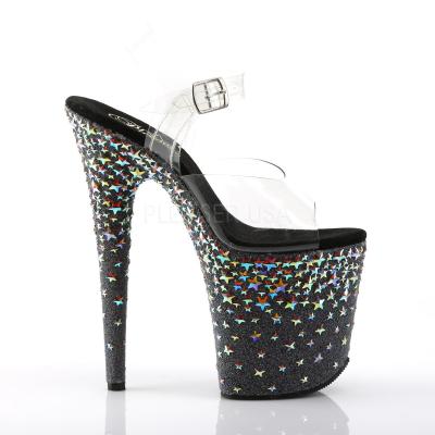 8 インチ (20.3 cm) ヒール、4 インチ (10.2 cm) プラットフォーム アンクルス トラップ サンダル Slv ホログラムを搭載プラットフォーム上の星します。(PF Ankle Strap Sandal w/Holo Stars)