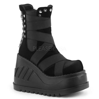 ◆ 4 3/4 インチ (121 mm) プラットフォーム ウェッジふくらはぎブート搭載チェルシー ブート スタイル弾性パネル、Criss 交差弾性バンド、ネジ鋲および Chainlink ディティール アップ バック、金属のジッパー閉鎖中 ◆