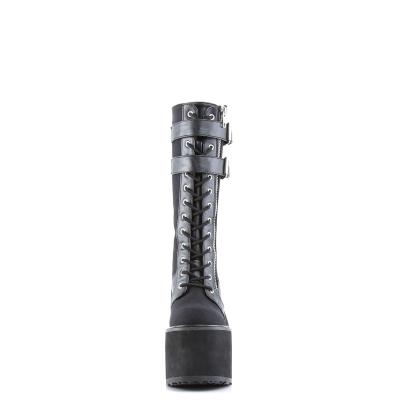 5 1/2 インチ (14 cm) ウェッジ プラットフォーム レースアップ フロント ニーハイ外側とダブル バックルのストラップで全室露出ジッパーを起動します。(PF Lace-Up Knee Boot w/Exposed Zipper & Buckle Strap)