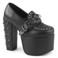 5 1/2 インチ (140 mm) かかと、3 インチ (76 mm) プラットフォーム ローファー特色デュアル バックル付けセンター、o リング ・ エンボス スカル パッチ、ヴァンプの詳細については丸スタッド ・かかとのとがった円錐形スタッドのスパイクの金属プレートのストラップ(PF Loafer w/ Buckle Strap)