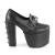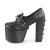 5 1/2 インチ (140 mm) かかと、3 インチ (76 mm) プラットフォーム ローファー特色デュアル バックル付けセンター、o リング ・ エンボス スカル パッチ、ヴァンプの詳細については丸スタッド ・かかとのとがった円錐形スタッドのスパイクの金属プレートのストラップ