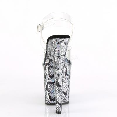 8 インチ (200 mm) かかと、4"(100 mm) プラットフォーム アンクルス トラップ サンダル ホログラフィック ヘビ皮印刷プラットフォーム底の特徴(PF Ankle Strap Sandal w/ Snake Skin Print)