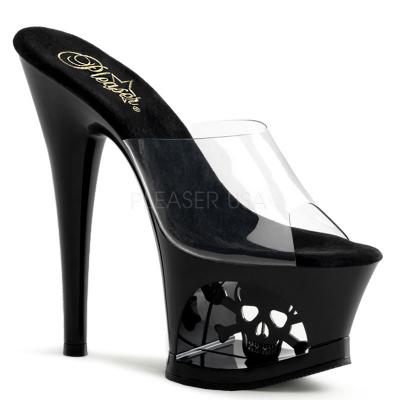 厚底サンダル/激カワガイコツのチャーム厚底サンダル〔全2色〕(ヒールの高さ約18センチ)【プリーザー/Pleaser】 空洞の厚底部分にクロスボーン付きの骸骨がチラッと覗くとってもキュートなプラットホームサンダル☆セクシーなのに遊び心のあるユニークデザインが超人気♪厚底部分が空洞になっているので通常の厚底サンダルより軽く、歩きやすいよ★ 【カラー展開】 ブラック/ホワイト ブラック/ブラック ヒールの高さ:7inch = 17.78cm