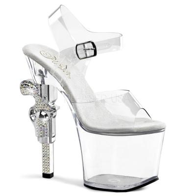 厚底クリアサンダル/プラットホーム/ピストルモチーフ×ラインストーン付ヒール/ヒールの高さ約18センチ【プリーザーUSA/PLEASER USA】 脚長効果が期待できるアンクルストラップ付クリアサンダル。ヒール部分はラインストーンが散りばめられた、ピストル風デザイン。(7inch=17.78cm) もっと足元を目立たせたいあなたには、このシリーズのゴールドorシルバー(品番:revolver-709g)もおすすめ!